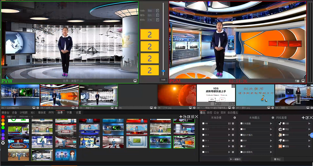 | 演播厅预置位 | 支持虚拟演播预置位设置与调用,支持导师播键盘三维控制。 |